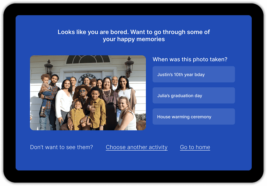Alzheimer’s patients often struggle with memory loss, which can strain their relationships with loved ones. CareBit’s cognitive games use personalized photos and memory-based questions to stimulate recall and strengthen connections. By engaging patients in familiar and meaningful interactions, it helps preserve their cognitive abilities while allowing caregivers to re-bond with them, fostering a sense of closeness and shared moments.